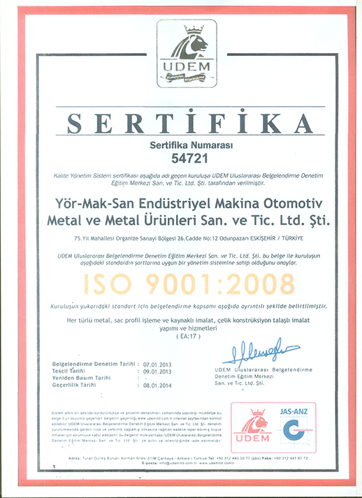EskiÅŸehirin seçkin firmalarından olan makine sektöründe faaliyet gösteren Yörmaksan Makine San.Tic.Ltd.Åžti. ISO 19001:2008 Kalite Yönetim Sistemi belgesini almaya hak kazandı.