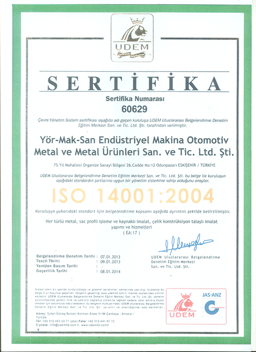 EskiÅŸehirin seçkin firmalarından olan makine sektöründe faaliyet gösteren Yörmaksan Makine San.Tic.Ltd.Åžti. ISO 14001 Çevre Yönetim Sistemi belgesini almaya hak kazandı.