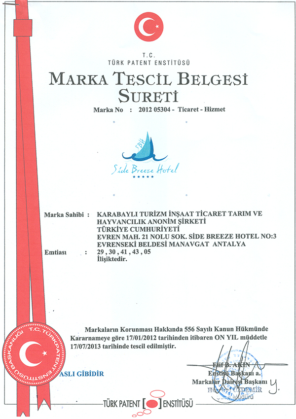 Antalyanın seçkin otellerinden olan turizm sektöründe faaliyet gösteren SİDE BREEZE HOTEL Marka Tescil Belgesini aldı.