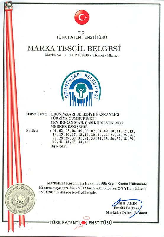 EskiÅŸehir Odunpazarı Belediye BaÅŸkanlığı tüm sınıflarda markasını koruma altına aldı. Marka Tescil Belgesi Türk Patent Enstitüsü tarafından onaylandı.