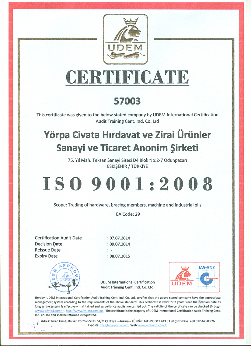 - YÖRPA CIVATA A.Ş NLP EĞİTİMİ VE ISO 9001 KALİTE BELGESİNİ ALMIŞTIR