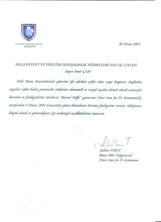 ESKİŞEHİR 1. ANA JET ÜS KOMUTANLIÄžININ ÅžEHİT AİLELERİNE YARDIM AMACLI KURULAN KARTAL VAKFI İÇİN DÜZENLENEN KERMESTE YARDIMLARINDAN VE DESTEKLERİNDEN DOLAYI MEGA PATENT VE YÖNETİM DANIÅžMANLIÄžINA VE SONER ÇAMA TEÅžEKKÜR YAZISI TAKDİM ETMİŞLERİDİR. KARTAL VAKFINA VE ESKİŞEHİR 1. ANA JET ÜS KUMUTANLIÄžINA BU İNCE DAVRANIÅžLARINDAN DOLAYI TEÅžEKKÜR EDERİZ.