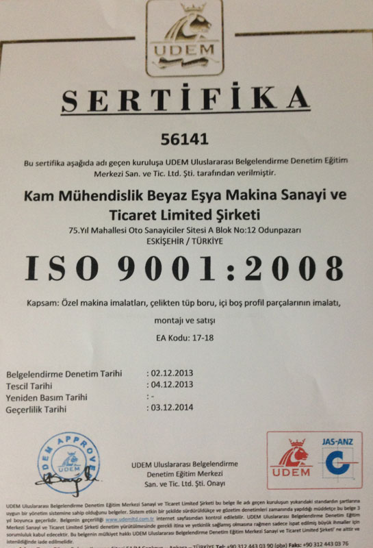 EskiÅŸehirin beyaz eÅŸya sektöründe faaliyet gösteren Arçelik tedarikçisi Kam Mühendislik San.Tic.Ltd.Åžti.ISO 9001:2008 Kalite Yönetim Sistemi belgesini almaya hak kazandı.