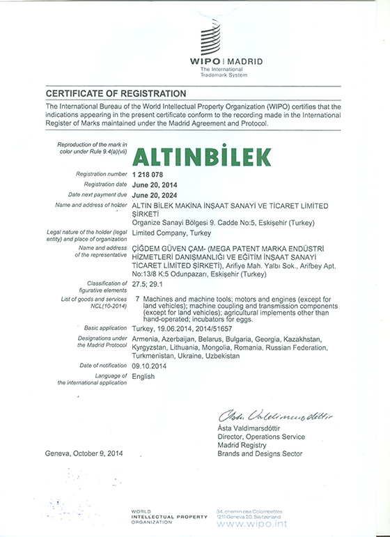 ALTINBİLEK MAKİNA LTD.ŞTİ. 14 ÜLKEDE MARKASINI TESCİLLETTİRDİ