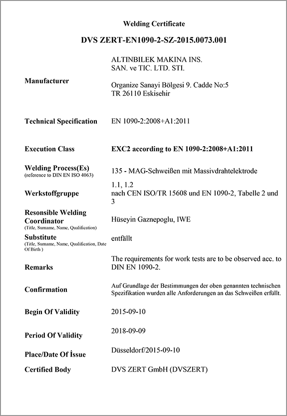- ALTINBİLEK MAKİNA İNŞAAT SAN. TİC. LTD.ŞTİ EN 3834-2 BELGESİNİ ALDI