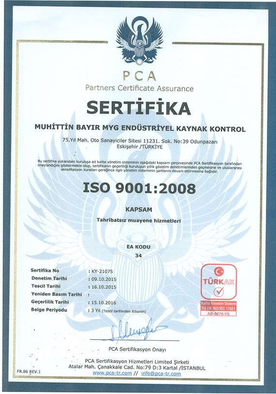 EskiÅŸehirin ilk özel NDT (tahribatsız muayene) firması olan MYG ISO 9001 Kalite Yönetim Sistemi belgesini almaya hak kazanmıştır. Kendilerine baÅŸarılar dileriz.