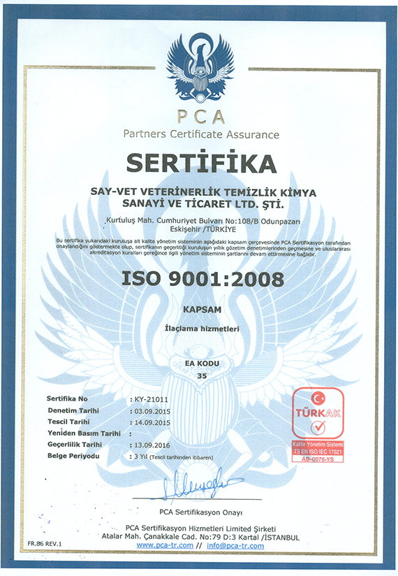 EskiÅŸehirin öde gelen ilaçlama firması olan SAY İLAÇLAMA ISO 9001:2008 Kalite Yönetim Sistemi belgesini almaya hak kazanmıştır. Kendilerine baÅŸarılar dileriz.